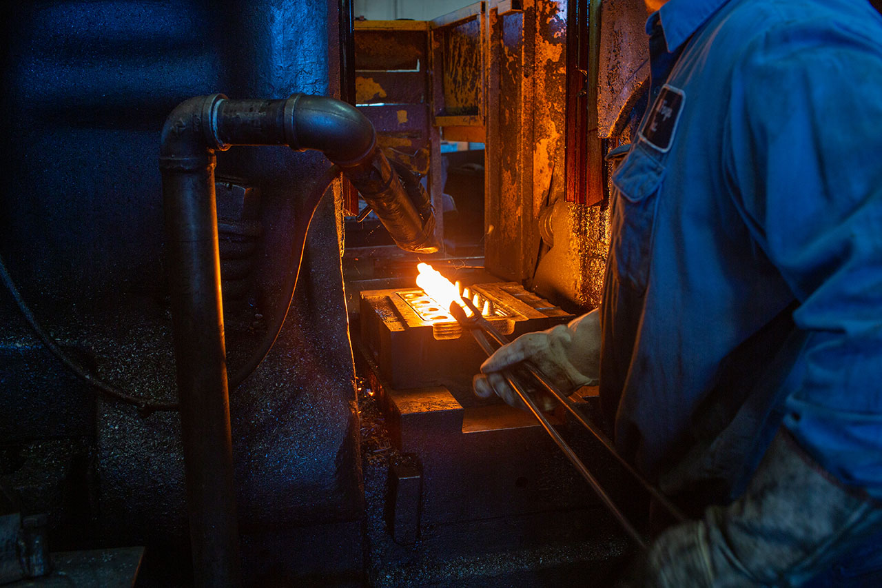 Stump grinding feeds being inspected as they come out of the wheelabrator